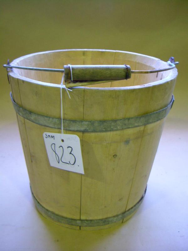 Kimpilaudoista koottu puinen sanko, jonka ympärillä kaksi metallivannetta. Sangon yläosassa on rautalenkit, joissa kiinni metallinen kahva, jossa puinen kädensija.