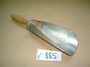 Puinen, sorvattu, pyöristetty kahva, jossa kaksi raitaa uurrettu. Kauhaosa kiinnitetty kahvaan pienin nauloin ja metallikaistaleella. Kauha on kärkeä kohti levenevä ja kourumainen.