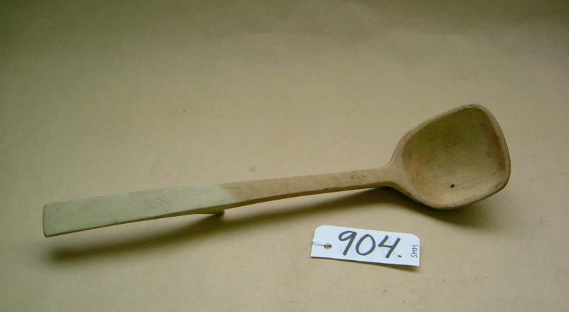Yhdestä puusta valmistettu kauha. Varren puolessa välissä on selkäpuolella kolmiomainen uloke. Kauha on käytössä tummunut ulokkeeseen asti.