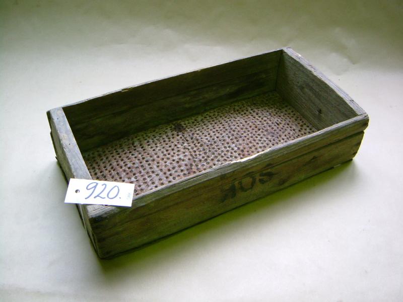 Nelikulmainen, naulattu puulaatikko, jonka pohjan muodostaa reijitetty metallilevy. Maalaamaton, yhdessä laidassa teksti: SOK.