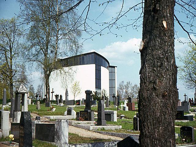 Vaalea, lähes suorakaiteen muotoinen rakennus, jossa musta tasakatto, edustalla hautausmaata.
