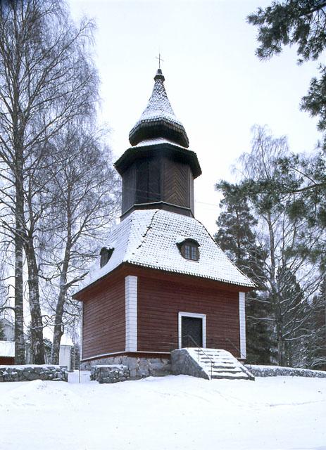 Puinen kellotapuli ulkoapäin. Talvikuva.