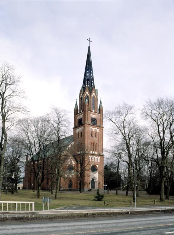 Keski-Porin tiilirakenteinen uusgoottilainen kirkko. Etualalla valkoinen aita.
