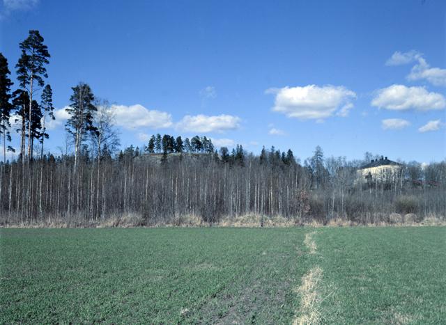 Maisema kohti Hakoisten linnavuorta ja kartanoa. Kartanon uusklassinen päärakennus kuvassa oikealla.