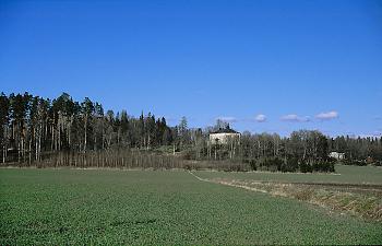 Maisema kohti Hakoisten linnavuorta ja kartanoa. Kartanon uusklassinen päärakennus kuvassa puiden takana. Peltomaisemaa etualalla.