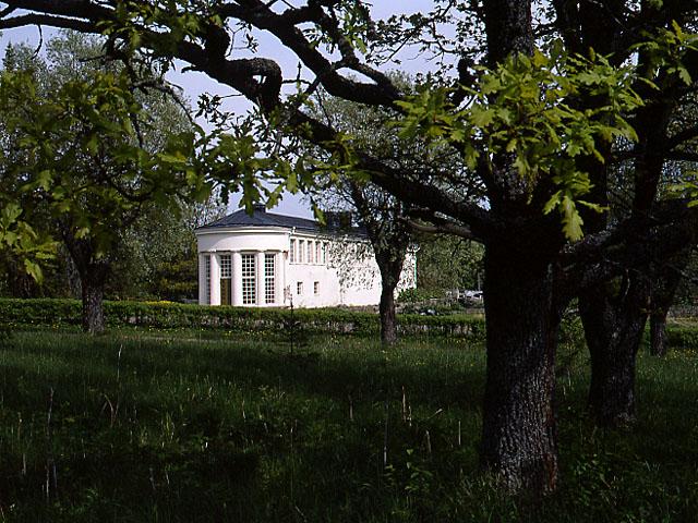 Oitbackan kartano; puisto, taustalla valkoinen rougeria eli kasvihuone.