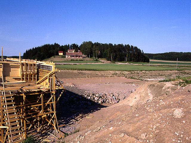 Muurla-Paimio moottoritien rakentaminen; kuvassa etualalla raivattua maata, vasemmalla puisia rakenteita. Taustalla maatilan rakennuksia.