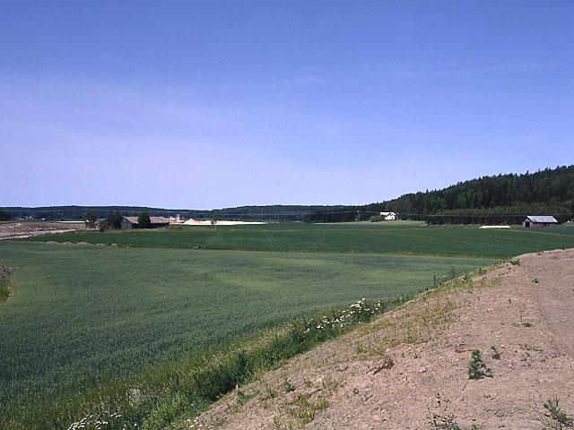 Muurla-Paimio moottoritien rakentaminen; kuvassa vasemmalla raivattua, keskeneräistä tietä ja lato. Etualalla peltoa, oikealla lato, ja taustalla metsää.