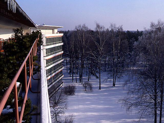 Parantolan potilashuonesiiven kattoterassi; näkymä kohti makuuhallisiipeä. Vasemmalla etualalla punainen kaide, oikealla puita. Funktionalismia.