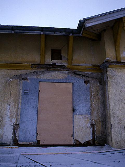 | diapositiivi: Meijerikoulu/Pikku-Auroran taidekeskus, purettu kuisti ja vauriot |