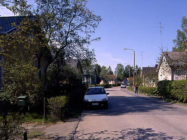 Pirkkolan rintamamiestalot. Kadun varrella autoja parkissa, katua reunustaa orapihlaja- aita.