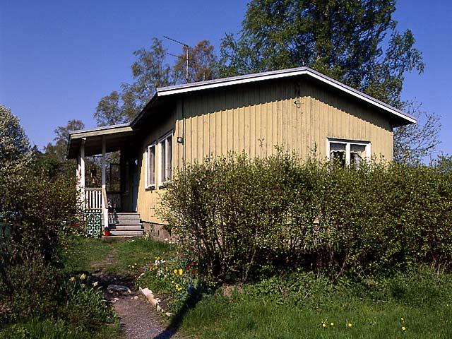 Pirkkolan rintamamiestalot. Puutaloa ympäröi orapihlaja-aita.