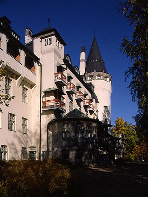Imatran Valtionhotelli, linnamaisen näköinen rakennus edestäpäin.