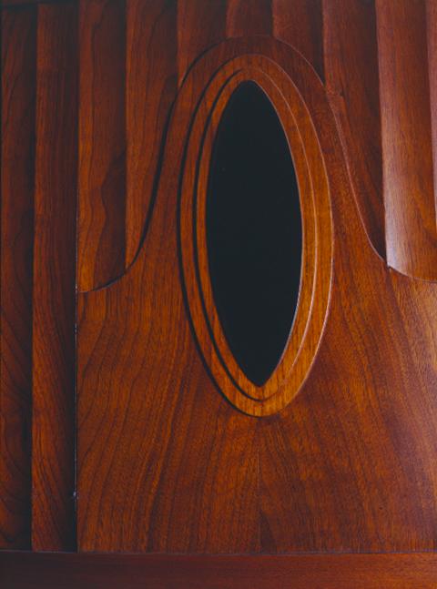Helsingin Joutsen apteekin sisustusta ja yksityskohtia. Kaapin oven kuviointia eli intarsiaa. Tyylinä art nouveau ja jugend.