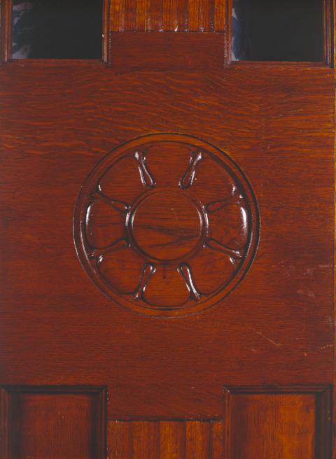 Helsingin Joutsen apteekin sisätilaa, sisustusta ja yksityiskohtia. Kuvio puupinnalla. Tyylinä art nouveau ja jugend.