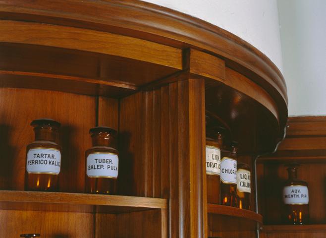 Helsingin Joutsen apteekin sisätilaa, sisustusta ja yksityiskohtia. Lääkepurkkeja hyllyssä.Tyylinä art nouveau ja jugend.