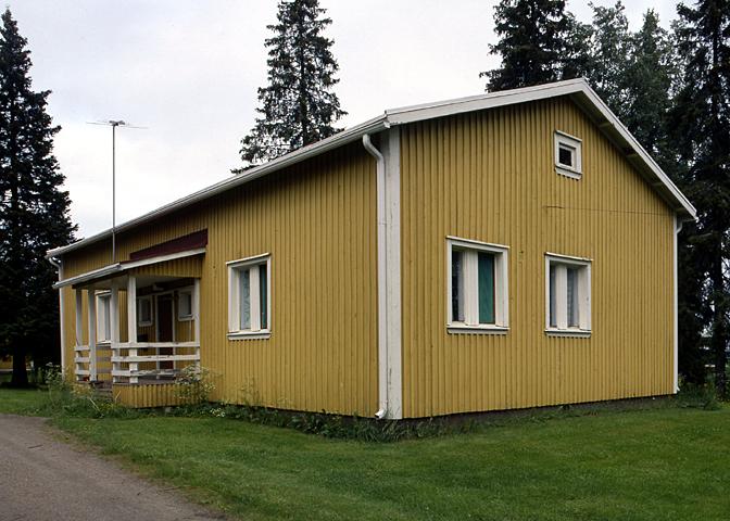 Keltaiseksi maalattu asuinkasarmi, puurakennus.