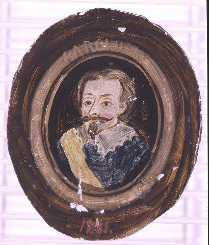 Soikealle lasinkappaleelle tehty maalaus. Miehen rintakuva vasemmalle. Ruskeat hiukset, pujoparta ja viikset. Haarniska ja leveä pitsikaulus. Tumma tausta. Kuvasoikion ympärillä harmaa ja ruskea reunus, jossa teksti: CAROLUS IX REX SVECIAE.