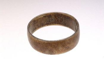 Sileä ja leveä, kullattu hopeasormus, varustettu kirjaimella R ja kahdella muulla leimalla.