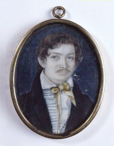 Miehen rintakuva lähes suoraan edestä, katse eteen. Tummanruskeat kihartuvat hiukset, iho vaalea, silmät siniset, ohuet viikset. Musta (mustansininen?) takki, valkoiset liivit, joissa ohuita sinisiä vaakaraitoja, paidassa leveä pehmeä kaulus, kaulassa keltainen rusetti. Tausta tummansininen. Kääntöpuolelle liimattu ruskeaa paperia. Kapea leikkaukseltaan pyöreä kehys kullattua hopeaa (soikea), ylhäällä ripustusrengas. Lasi.