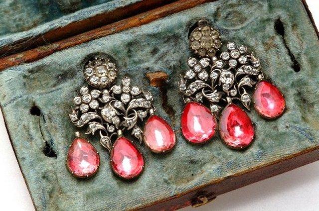 Korvakorupari, hohtokivillä täytettyjä hopeisissa kukanmuotoisissa kiinnoksissa; kummastakin renkaasta riippuu kolme punaista hohtavaa lasihelyä. Ovat vanhassa sahviaanilla päällystetyssä ja siniviheriällä sametilla sisustetussa kotelossa, josta pari sormusta ja kuusi irtonaista soikeata helyä on kadonnut.