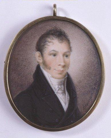Miehen rintakuva oikealle. Tummat, eteenpäin kammatut, kiharat hiukset, pulisongit; siniharmaat silmät. Musta takki, valkoinen liivi ja korkeakauluksinen paita. Valkoinen kaulaliina. Sinipunertavan harmaa tausta. Kuvan päällä lasi. Kääntöpuolella lasin alla valkoisella silkillä ruskea hiuskiehkura. Kapea messinkikehys jossa ripustuslenkki.