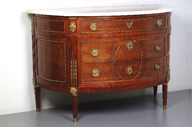 Etusivultaan puolipyöreä lipasto, jossa kolme vetolaatikkoa edessä ja sivuilla kaapit. Viilutettu pähkinäpuulla, messinkihelat, pöytälevy valkoista marmoria.