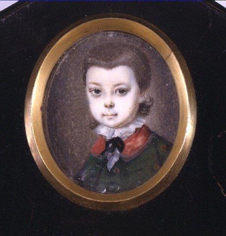 Soikea miniatyyri. Lapsen (pojan) rintakuva hiukan vasemalle, katse eteen. Ruskeat, päältä lyhyiksi leikatut hiukset, niskassa pitemmät kiharat. Tummanruskeat silmät. Vihreä, punakauluksinen takki, vihreä liivi. Valkoinen röyhelökauluksinen paita, musta rusetti kaulassa. Ruskea tausta. Voimakkaasti profiloitu messinkikehys. Kuvan päällä lasi, kääntöpuolella kupari(?)levy. Miniatyyri on kiinnitetty mustaksi lakattuun, viiteen osaan taittuvaan puuraamiin, jossa on miniatyyrit KM 26069:279.1-11.