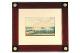 Kartanomaisema, vasemmalla päärakennus, etualalla alareunassa aita, keskellä niittyä ja puita. Taustalla järvi, jonka keskellä saari ja pieni purjevene. Mahonkikehys, jossa pronssirosetit mustissa kulmaneliöissä.