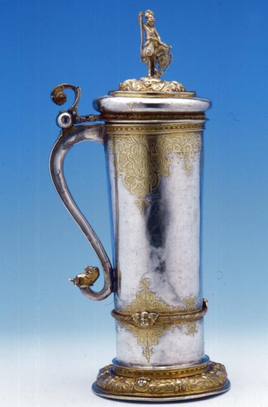 Korkea, kapea lieriökannu. Jalkarengas, kupera, profiloitu. Kansi kupera, profiloitu, nuppina soturi kilpi kädessä. Kädensija S-muotoinen, alhaalla päättyy plastilliseen hevosenpäähän; peukaloripana leveä kierukka. Jalkarenkaassa ja kannen keskikupurassa pakotettu renessanssikoristelu: jäykkien nauhakartussien keskellä maskit ja välissä hedelmäryhmiä sekä levitetyin siivin astelevia lintuja. Kannun alaosassa hopea-nyöri. jonka koristeena kaksi valettua enkelinpäätä. Nyörin kohdalla, yläreunassa ja kannessa renessanssityylinen kaiverruskoristelu: symmetristä nauhasuikeroa, joka järjestyy suuremmiksi kolmiokielekkeiksi. Pakotukset ja kaiverrukset ovat kullatut. Kannun halk. 8 cm, jalan halk. 10,5 cm.