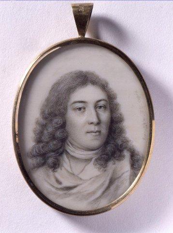 Soikea miniatyyri, nuorehkon miehen rintakuva, kasvot oikealle. Pitkät kiharat hiukset. Viittaan kääriytynyt, kaulassa huivi. Grisaille-maalaus. Kullattu hopeakehys jossa ripustuslenkki. Kääntöpuolella kuviollinen sillkikangas lasin alla. Kopio Elias Brennerin omakuvasta.