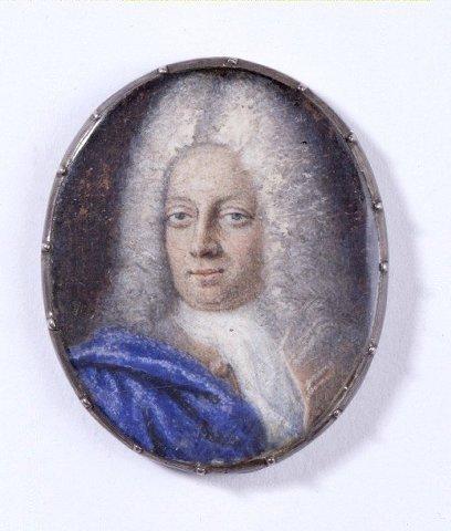 Miehen rintakuva. Suuri valkoinen kiharaperuukki, siniset silmät. Vaaleanruskea takki, valkoinen paita ja kaulaliina. Sininen viitta oikealla olkapäällä. tummanharmaa tausta. Yksinkertainen hopeakehys. Kuvan päällä lasi.