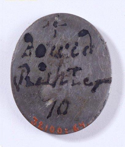 | huomiot | Osan materiaali: metalli; Merkintätekniikka: kirjoitus; Osa: kehys; Erityispiirteet: soikea; Merkinnän kuvaus: mustalla maalilla; Aineistotyyppi: esine |