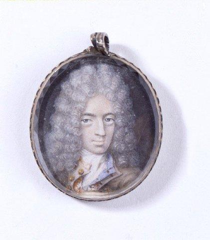 Miehen rntakuva oikealle. Suuri harmaanvalkoinen kiharaperuukki, harmaat silmät. Vaaleanruskea takki, jossa sininen vuori tai sinivuorinen liivi. Takissa kullanväriset napit. Valkoinen kaulaliina. Tummanharmaa tausta. Kuvan päällä reunoista fasettihiottu lasi. Hopeakehys jossa ripustuslenkki.