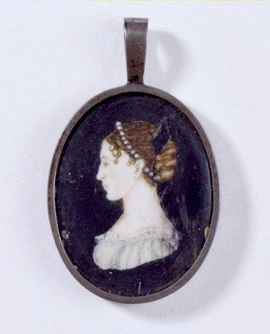 Naisen rintakuva profiilista vasemmalle. Punaruskeat hiukset koottu taakse nutturalle suuren kamman avulla. Pään ympärillä helminauha. Vaaleansininen avokaulainen puku, kaula-aukon reunassa valkoinen pitsi. Mustanharmaa tausta. Kapea hopeakehys jossa ripustuslenkki. Kuvan päällä lasi.