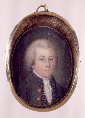 Soikea miniatyyri. Keski-ikäisen miehen rintakuva, hieman oikealle kääntynyt. Harmaat (puuteroidut) taaksepäin kammatut hiukset, siniset silmät. Harmaanvihreä takki jossa kultanapit, musta-harmaa raidallinen liivi jossa oranssin värisiä pillkuja. Valkoinen kaularöyhelö ja -liina. Vihreänharmaa tausta. Kullattu metallikehys, joka on miniatyyriä suurempi, miniatyyrin takana on ruskeista hiuksista punottu matto. Kehyksessä ripustuslenkki ja -rengas.