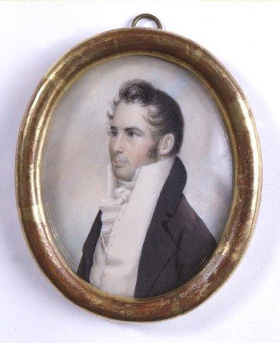 Miehen rintakuva vasemmalle. Tummat eteenpäin kammatut hiukset, pulisongit. Ruskeat silmät. Musta takki, valkoinen korkeakauluksinen liivi, valkoinen kaulaliina ja -röyhelö. Vaaleansininen ja -punertava tausta. Kuvan päällä lasi. Kullattu, pyöreäksi profiloitu (myöhäinen) puukehys, kultauksen alta näkyy punaruskeaa pohjustusta. Ripustuslenkki.