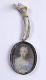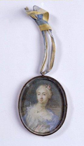 Naisen rintakuva, vartalo oikealle kääntynyt, pää hiukan vasemmalle. Vaaleat (puuteroidut?) taaksepäin kammatut hiukset, hiuksissa vaaleanpunainen ruusu ja muita kukkia. Siniset silmät. Vaalean siniharmaa avokaulainen puku, sininen hartiahuivi. Kauluksessa ja hihansuissa valkoista pitsiä, hihassa myös vaaleanpunaista kangasta. Tausta harmaanvihreä, alaosassa rusottava. Kuvan päällä reunoista fasetoitu paksuhko lasi. Kullattu hopeakehys jossa ripustuslenkki, kääntöpuolella lehväaiheista kaiverruskoristelua ja monogrammi CS.