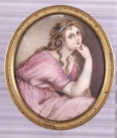 3/4-vartalokuva nuoresta, oikealle kääntyneestä istuvasta nuoresta naisesta, jolla on vaaleanruskeat hiukset ja siniset silmät. Oikea kyynärpää nojaa polveen ja leuka oikeaan käteen. Pukeutunut punaiseen, avokaulaiseen pukuun, hiuksissa sininen nauha. Tausta ruskea. Kuvan päällä lasi. Messinkikehys. Uusi taustapahvi.