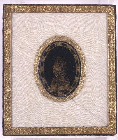 Soikea miniatyyri/siluetti, miehen rintakuva profiilissa vasemmalle. Kullanvärinen hahmo mustalla pohjalla. Eteenpäin kammatut hiukset, everstin univormu. Korkea kaulus, epoletit ja kaluunat. Rinnassa kunniamerkkejä. Kuva-alueen reunassa kullanvärinen koristereunus. Suorakulmainen kehys, kuvan ympärillä kultapaperireunus. Kuva ja sen ympärillä oleva valkoinen moiree-silkki lasin alla. Ulkoreunassa lasin päällä koristeellinen kultapaperireunus.