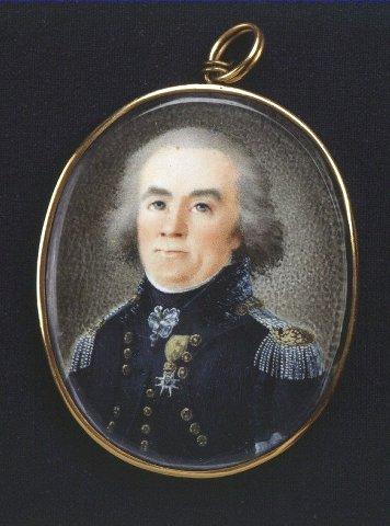 Keski-ikäisen miehen rintakuva hieman vasemmalle. Harmaat hiukset ja siniharmaat silmät. Ruotsalainen laivastounivormu: tummansininen takki ja liivi joissa kultanapit. Hopean- ja kullanväriset epoletit. Miekkaritarikunnan kunniamerkki. Valkoinen paita ja pieni kaularöyhelö, musta kaulaliina. Harmaa tausta. Kuva lasin alla, kapea kultakehys jossa ripustuslenkki ja -rengas. Kääntöpuolella lasin alla ruskeista hiuksista punottu matto.