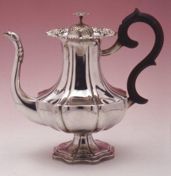 Korkea, jalallinen. Koristettu pystysuorilla syvillä uurteilla. Korva kaareva, koristeellinen, mustaksi maalattua puuta. Nokka pitkä, päättyy eläimen päähän. Kannun yläreuna ulospäin taivutettu, päällä kukka- ja lehtinauha. Kansi pyöreä, pieni, päällä kukan muotoinen nuppi.