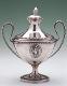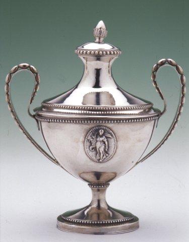 Sokeriastia, hopeaa. Uusklassillinen, korkea, uurnareunustainen. Läpileikkaus soikea. Korkeitten kaarevien kädensijojen pinnassa on paksut plastilliset helminauhat. Reunakoristeina helminauhat. Maljan molemmilla puolilla on reliefisoikiot, joista toisessa on kuvattu nainen runsaudensarvi kädessä ja toisessa istuva nainen kilpikonna jaloissaan. Kannessa on lehtituppi.
