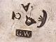 | huomiot | Osan mitat: leveys 5.80 cm; leveys 9.40 cm; Leima: G.W.; kruunu ja vene; A 2; kruunu; Tyyli: biedermeier; Merkinnän kuvaus: suorakaiteessa; puolikas; Osa: pohja; suu |