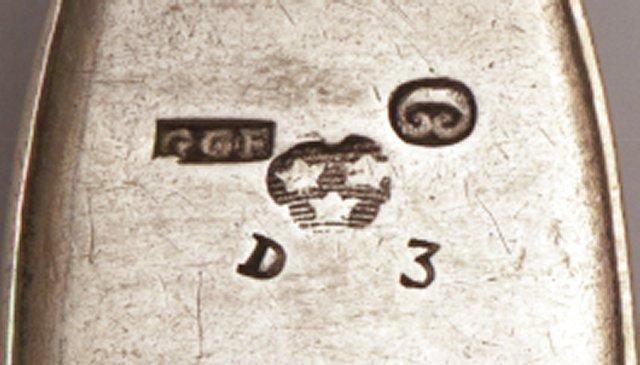 | huomiot | Osan mitat: pituus 8.20 cm; leveys 4.30 cm; Nimikirjaimet: I.G.H.A.; Leima: GGF; kolme kruunua; D 3; Tyyli: empire; Merkintätekniikka: kaiverrus; Osa: pesä |