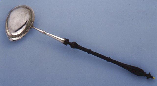 Hopeaa, varren yläosa on sorvattua, mustaksi maalattua puuta; pieni luunuppi. Pesä on syvä, toiselle sivulle suippeneva; varsi liittyy pesään lehdenmuotoisena kielekkeenä.