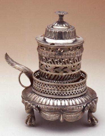Sinappitölkin lieriömäinen, sivuista nauhamaisesti lävistetty, saranakantinen pesä on kiinnitetty pyöreään jalustaan, jossa on lävistetty pystyreunus. Jalustan päällistä koristaa lehtinauha, sivuja riippuva lehtiköynnös; kolme käpäläjalkaa, jalkojen välissä draperia-aiheista koristelua. Pyöreän rengasmaisen kädensijan päällä lehtikoriste. Kannessa on ruusukemainen nuppi. Koristeena on runsaasti erilaisia lävistettyjä lehti-, ruusuke- ym. nauhoja. Lasiastia sisältä puuttuu.