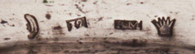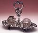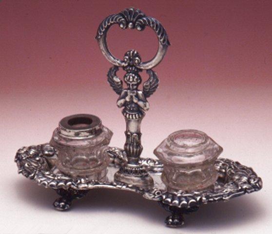 Pitkänomainen tarjotin, jonka laidassa on puristettua lehti- ja kiemurakoristelua. Tarjottimessa on käpäläjalat ja keskeltä nousee enkelivarsi, joka päättyy soikeahkoon renkaaseen. Tarjottimessa on kaksi kehää mustepulloja varten. Pullot lasisia kannettomia. Toisen pullon suusta puuttuu hopearengas.