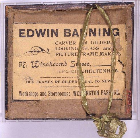 | huomiot | Osan materiaali: puu; Osan Pintamateriaali / käsittely: maali; Merkintätekniikka: painatus; Osa: kehys; Kirjoitus: EDWIN BANNING/ CARVER and GILDER,/ LOOKING-GLASS and/ PICTUREFRAME MAKER,/ 97, Winchcomb Street/ CHELTENHAM/ OLD FRAMES RE-GILDED EQUAL TO NEW /Workshops and Storerooms: WELLINGTON PASSAGE; Erityispiirteet: pystysuorakaide; Aineistotyyppi: esine |