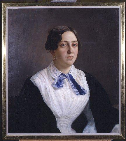 Naisen puolivartalokuva oikealle. Tummanruskeat sivuille kammatut hiukset, harmaansiniset silmät. Valkoinen puku, jossa laskostettu miehusta, kiristetty vyötärö ja valkoinen alas käännetty kaulus, jossa sinisiä pilkkuja. Kauluksen alle solmittuna sininen nauha, jossa valkoisia raitoja. Hartioilla tummansininen huivi. Kullanväriset riippuvat korvakorut, joissa helmet. Nainen istuu tummanruskealla tuolilla. Harmaa tausta. Uusi kapea, kullattu kehys.